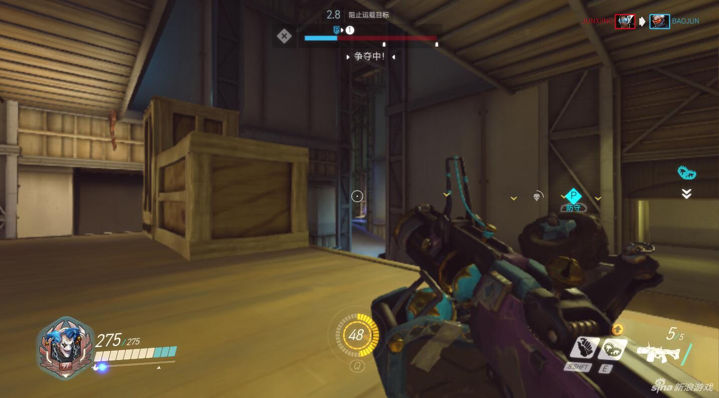 如果一旦近距离2楼失守,狂鼠在下一次复活后的防守点位应该选择仓库右侧的2楼位置,这里是进攻方与防守方的必争之地,在防守中狂鼠可以利用炸弹和捕鼠夹封住入口,同时在2楼对敌人的运载车队造成持续伤害,甚至可以在血量极少时从2楼跳下,利用死亡后的爆炸与对手同归于尽。