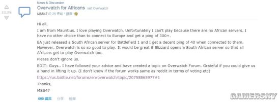 “我很爱玩《守望先锋》,”Sookia写道:“不幸的是,由于没有非洲服务器,我几乎没法玩。我别无选择,只能选择登陆欧服顶着300+的ping游玩。EA最近就推出了《BF1》的南非服务器,我在连接南非服的时候只有40的轻微延迟。但是,《守望先锋》是太太太好玩了。如果暴雪能够开放一个南非服务器让所有非洲玩家都能玩《守望先锋》就好了。请不要忽略我们。”