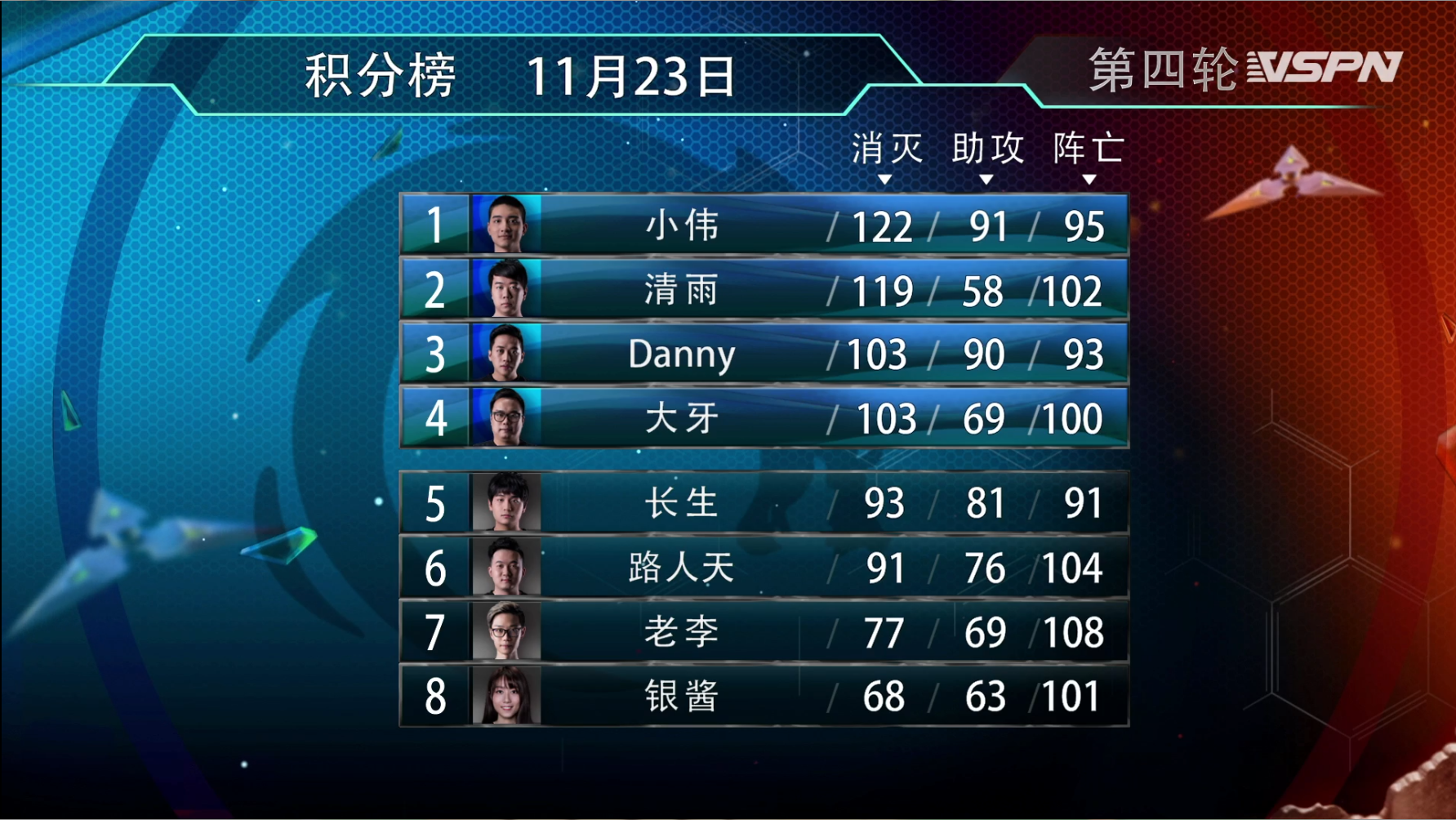 随后的第三、四局终于进入了比赛的重头戏——八人自由死斗之中。而此时8位选手的比分相差距离并不算大,只要在后两局中表现出色,任意一位选手都有晋级8强的可能。