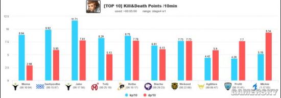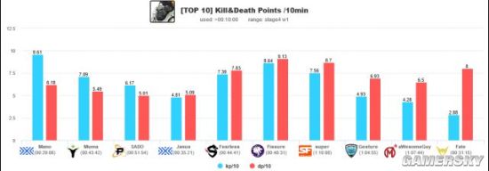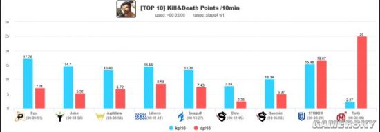 前7名射手的数据和后3名产生了明显的断档。纵然一再努力,surefour仍然没能进入顶尖狙击手的行列。sayaplayer纵然有出色的准度,但他的高死亡率使他甚至没能进入前10。