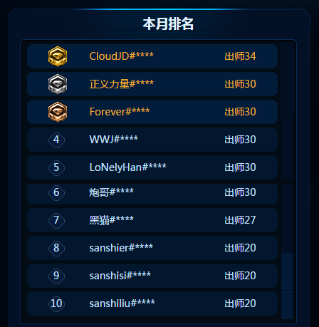 我们再来看一下《星际争霸II》“师徒系统”10月教官排行榜啦!一起来看看10月前十是哪些优秀教官吧!
