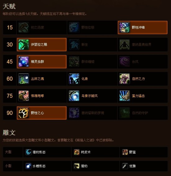 雕文,这里只说大雕文,第一猎豹雕文,这是必选;第二树皮雕文,面对茫茫多的战X、死X,树皮雕文能更好的保护住野德的小身板,只有碰到法师带治疗的队伍我才会把树皮雕文换成精灵火沉默雕文,因为深结和冰指的高爆让树皮雕文很鸡肋,所以换精灵火沉默效果更佳;第三是免费野蛮咆哮,现在菜刀队比较多大部分我都是选择用撕碎雕文替换野蛮雕文,22里起手偷袭在咆哮打伤害并不影响多少输出毕竟这不是插旗,每30秒一次无站位的3撕碎更符合我心意。