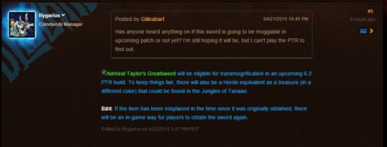 A:在即将到来的6.2 PTR build中,[海军上将泰勒的大剑]可以进行幻化。为了保持公平,在塔纳安丛林中部落也将获得相应的装备(颜色不同)。