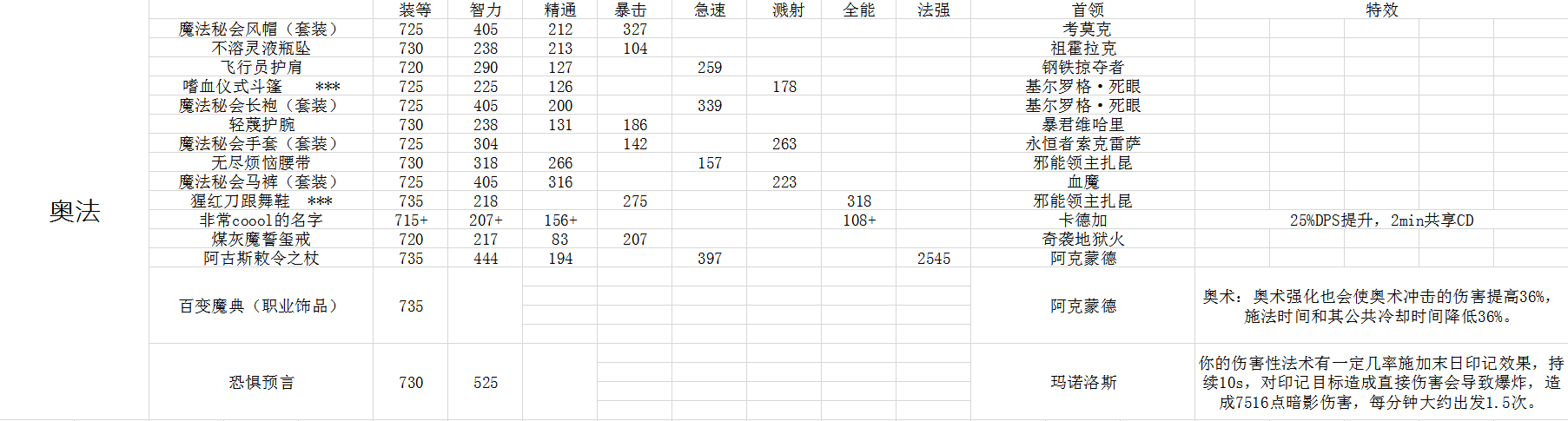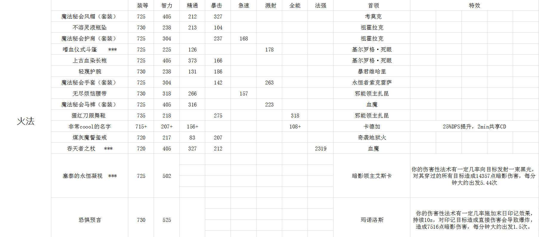 表格中打***的装备选择存疑,其他可放心食用,火法的职业饰品就个人感觉而言实际效果不如这个AOE饰品,不过这个SP需要调整好角度才能最大化输出,毕竟是Biu~的一条直线。