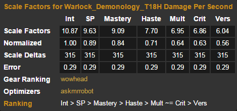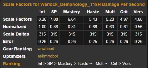 对于三目标,专精的选择甚至不是一个问题——痛苦就是爸爸。即使不穿套装,痛苦也依然优于其他两系。看上去很蠢的是,痛苦2T17M+2T18H的组合居然不如一件套装都不穿的痛苦,但我仅仅只是采用了几件急速/精通较高的散件来代替而已。