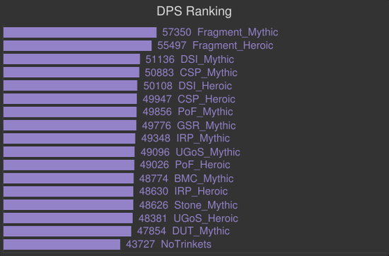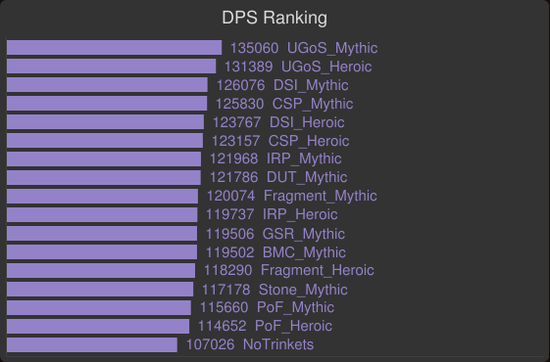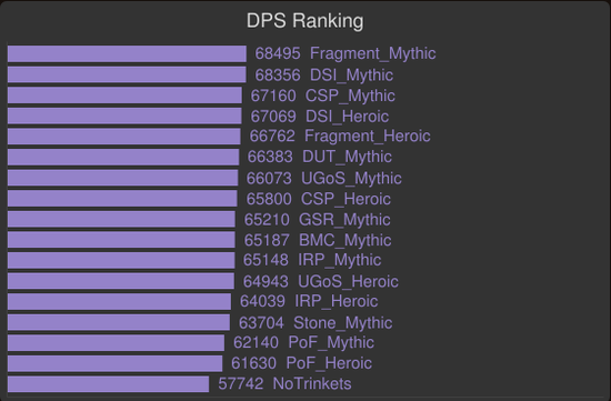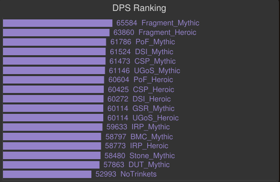 对于那些需要高爆发AOE的场合,例如考莫克的小手和暗影领主艾斯卡的上天阶段,这是饰品评分的所采用的场景。基于这点,大灾变被使用了,所以黑暗之星碎片和塞泰的永恒凝视胜出。亵渎影月徽记和碎裂的灵魂棱镜依旧很强力,这些饰品通用性相当不错。