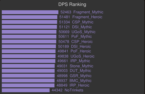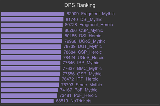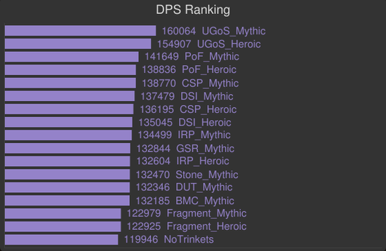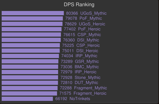 下面是单目标的饰品模拟。包括了M难度T17级别的SP,715炼金石和H/MT18级别的饰品,基于715装等和T18套装的模拟。黑暗之星碎片登顶,碎裂的灵魂棱镜和亵渎影月徽记并列第二。塞泰的永恒凝视即使是在恶魔术的单目标战中也相当不错,所以记住这一点,当我们玩恶魔术时,这个饰品一定会随着目标数量的增加而带来更大的收益。