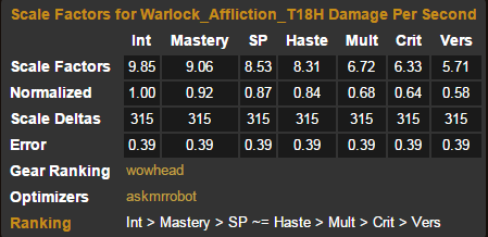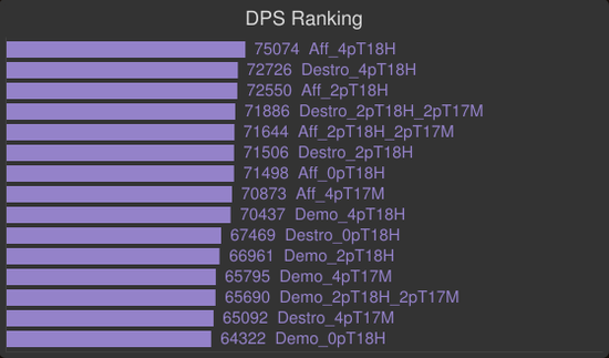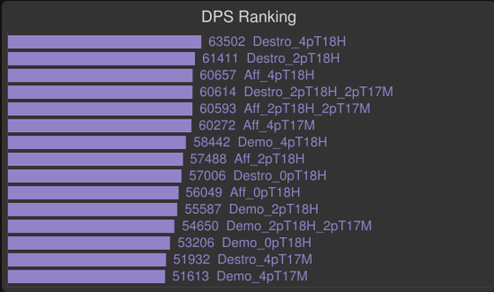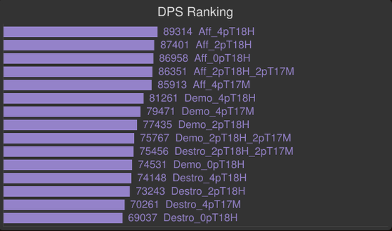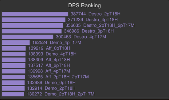 你可以看到,2T17M和2T18H的模拟值非常接近。不要放弃你的2T17M直到你拥有了4T18H。在拿到2T18H后立刻拆散你的4T17M。痛苦术应该尽早装备上2T18而放弃4T17效果。