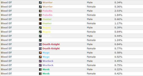人类最喜欢的职业为圣骑士,圣骑在男性和女性中都是最受欢迎的,谁叫暴风城就是信仰圣光的呢?第二受欢迎的职业则发生了分歧,男性更喜欢成为瓦里安式的战士,女性则倾向于成为一名术士。