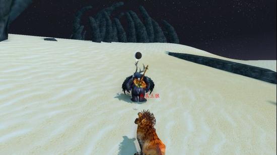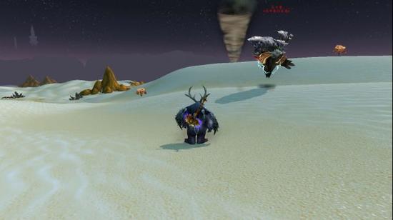 玩够了伙计们,继续出发了。说起来你们好记得之前我们吃过的那种鸟么?叫做炎鹏的家伙。这里有个跟它很像的东西,火鹏……哪个有着恶趣味的奇葩给它们起的名字啊,真奇怪。这时我感到四周好像不太对劲。好像风越来越大了,难道是沙漠风暴?!看远处!一个大型龙卷风生成了!这一定是奥拉基尔搞的鬼。一群风元素在这里游荡,作威作福,它们的首领应该就是这个叫做叫做扎卡鲁<玛卡里的后裔>的家伙吧。哦不不不不不不!!!!我被龙卷风吹起来啦!快振翅!呼,吓死我了,总算是安全落地了,赶快离开这个是非之地吧!下回再来这里一定要带个地精滑翔机。