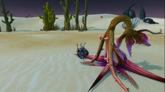 走了没多久我就感到了口渴难耐。毕竟这在沙漠中是避不开的问题。我并不想过早的消耗我的水储存量,所以我选择了这个沙漠鞭笞者——看看我们能不能从它身上弄点水喝。拔掉那些恼人的尖刺后,它坚韧的根茎表皮就显露在了我的眼前,用刀在上面划一个三角形的口子,一股淡绿色的粘稠分泌物就慢慢淌了出来。用力吮吸——哦天哪,这味道,简直就像腐烂了六个月的石颚怪!不过这吓不倒我们,还记得我教过你们的格里尔斯想象法吗,就当它是铁炉堡的麦酒吧,喝下去。哈,美味多了。