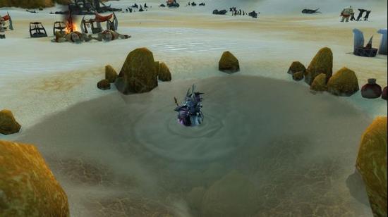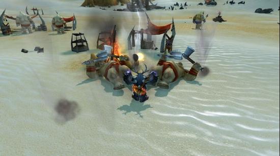 果然不出我的所料,这就是沙漠中的甜水绿洲了。这种宝贵的资源自然不会放在那里等着我去拿,一群沙槌食人魔早就占领了这里。沙槌食人魔们凭借着一身蛮力霸占着这里已经很久了。可惜他们占了我看上的水,当然不能放过了。我不想把事情闹的太大,于是我躲开了营地外围放哨食人魔的视线潜入营地,这两只看守水源的食人魔不能再不管了,出手吧!鹿角仰,风暴起,天怒显神威,一阵我召唤的飓风瞬间就击败了这两个愚蠢的家伙。啊!清澈的水,让我们跳进这个小水潭,好好的戏耍一会吧!
