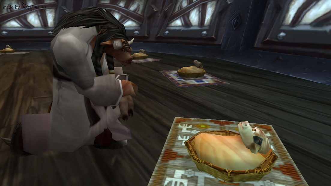 忘记在什么地方,只记得是在一个屋子的二楼,一个母牛头人安静的照顾几个小牛头人宝宝。