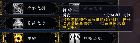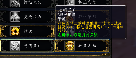 狂热:依旧是cd冷却,伤害变低,但提供攻速提高的buff,每层提高20%,最多3层,持续12秒。同时十字军打击的伤害可以弹射,但目前没效果。
