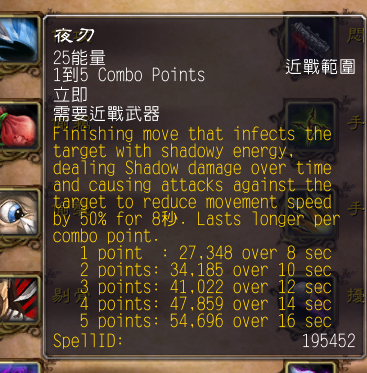 幽暗之刃 35能量 需要匕首 为你的武器注入暗影能量并戳击目标,造成15136点暗影伤害,奖励1点连击点数 取代背刺 |
