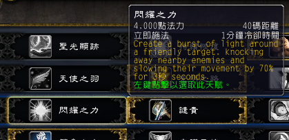 在一个友方目标周围制造一次圣光爆发,击退附近的敌人,并使他们的移动速度降低70%,持续3秒。 1分钟冷却。