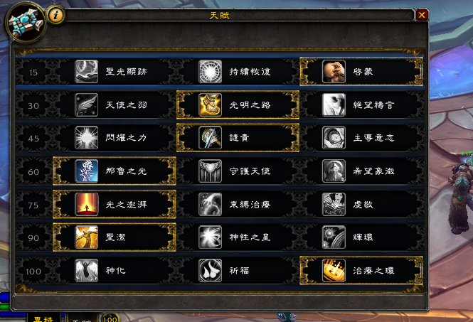 100级天赋表现中规中矩在团队副本中大概会选择治疗之环比较多吧,那个愈合祷言附带恢复因为不是智能治疗还是有思忖的,神圣化身的冷却时间3分钟实在太不够意思了。