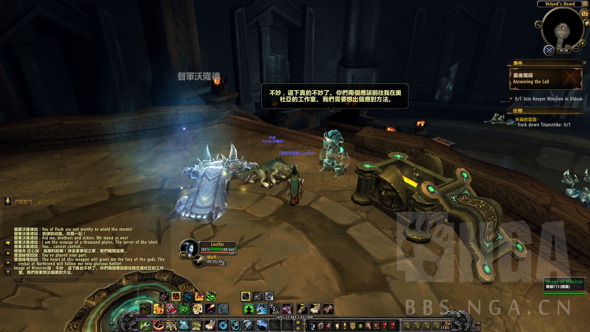 在一扇大门前看到了一面旗帜:这里沉睡着督军沃德隆,泰坦神器给予了他无穷的力量。他在古老的土地唤醒了一个强大的先祖造物。并为了阻止他毁灭风暴峡湾而死