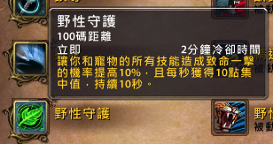 野性守护:100码距离,2分钟冷却。让你和宠物的所有技能造成爆击的几率提高10%,并且每秒获得10点集中值,持续10秒。
