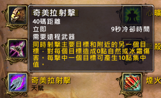 奇美拉射击:40码距离,9秒冷却。同时射击主要目标和附近的另一个目标,对每个目标造成自然和冰霜伤害。每击中一个目标,产生10点集中值。