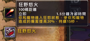 狂野怒火:100码距离,1.5分钟冷却。你和宠物进入狂怒状态,使你和宠物造成的伤害提高20%,持续15秒。