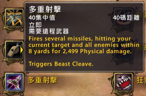 多重射击:40集中值,40码距离。对当前目标和八码范围内的敌人造成 2499点物理伤害,触发野兽顺劈斩。