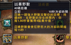 凶暴野兽:40码距离,10秒冷却。召唤一头强大的野兽攻击你的目标,持续8秒。在野兽存在时间内,没1.8秒会获得4点集中值。召唤野兽会使狂野怒火的冷却时间缩短15秒。
