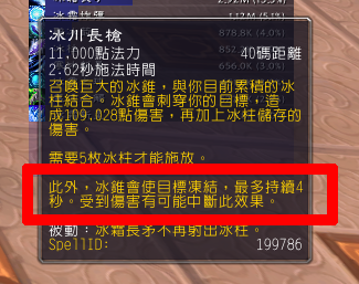 冰法出了。目前很想知道常规天赋t6第2个冰川长矛是否为一个独立法术?以及这法术生效的机制是什么?比如是一个完整的法术伤害,即500%*sp初始伤害以及5冰刺伤害合并统一作用于目标,还是500%*sp初始伤害以及5冰刺伤害分二段作用于目标,然后初始伤害可暴击,冰刺依然不可暴击?如果是前者的话,貌似可以期待。按现如今冰箭伤害公式来看,180%*sp,假设精通为50%,则有冰川长矛500%+180%*50%*5=950%*sp的伤害,如果算上冰箭的各种增幅,则伤害轻松破10倍法伤加成,如果可以造成暴击,那么这个技能可以轻而易举造成超过20倍,于pvp目标可超过15倍的法伤,个人认为是冰法最具威慑并最有前景的伤害技能。就算正式服没有了深结,由于此技能自带冻结效果,其后再接一发黑檀箭的话,应该是可以直接收割掉一个半血甚至大半血的敌人?