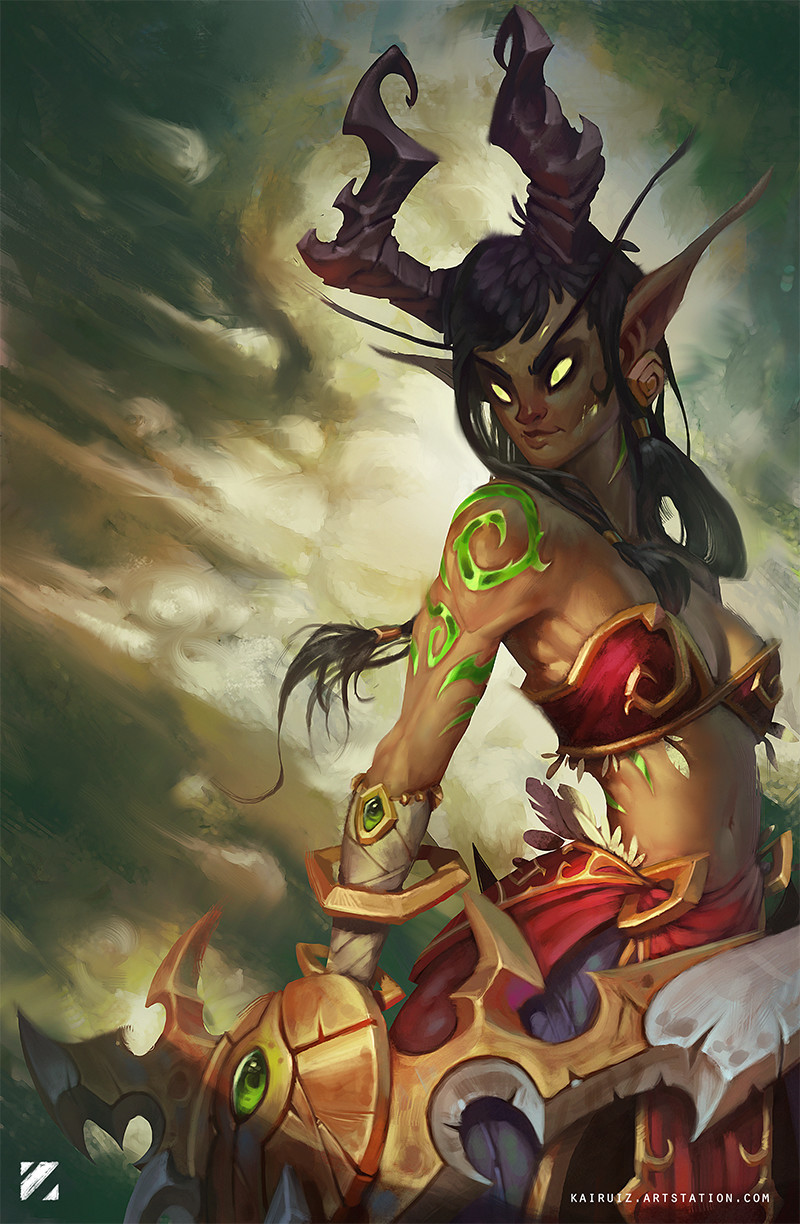 魔兽世界官方推特推荐了一位来自西班牙的画师Carlos Nuñez Ruiz的原画作品,他画的是一位血精灵少女恶魔猎手。画风独特,画面有很强的张力,少女肃穆的表情和绷紧的双臂仿佛下一秒就要冲上前线。