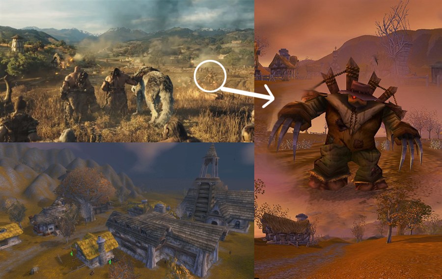 邻近艾尔文森林和暮色森林,重建暴风城的工匠们因为被拖欠工资而造反,成为迪菲亚盗贼,西部荒野就是他们的领地之一,《魔兽世界》第一个副本“死亡矿井”就在西部溪谷的月溪镇里,大家肯定不会陌生吧!电影里杜隆坦和奥格瑞姆眺望着远方,眼前一片被兽人蹂躏过的景象,注意看白圈的部分,还有一只偷偷露了个背影的西部荒野经典小怪——麦田傀儡。
