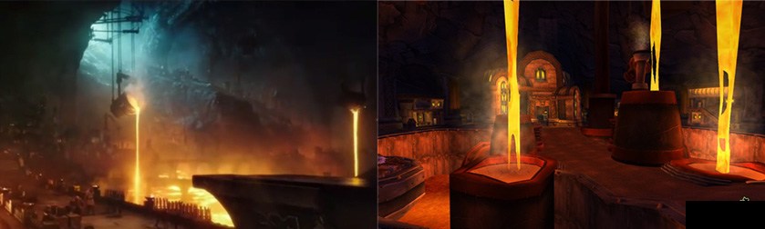 丹莫罗山顶上的铁炉堡,是矮人和侏儒的主城,电影高度还原了铁炉堡充满金属工业的感觉,从顶部往下倾注而下的熔岩,配合矮人工匠的技艺,诞生了多少不可思议的装备,侏儒也是在这里研究开发各种高科技机械的。