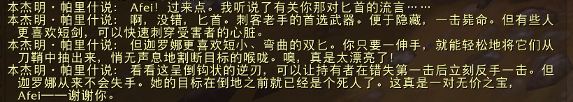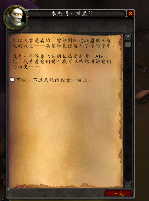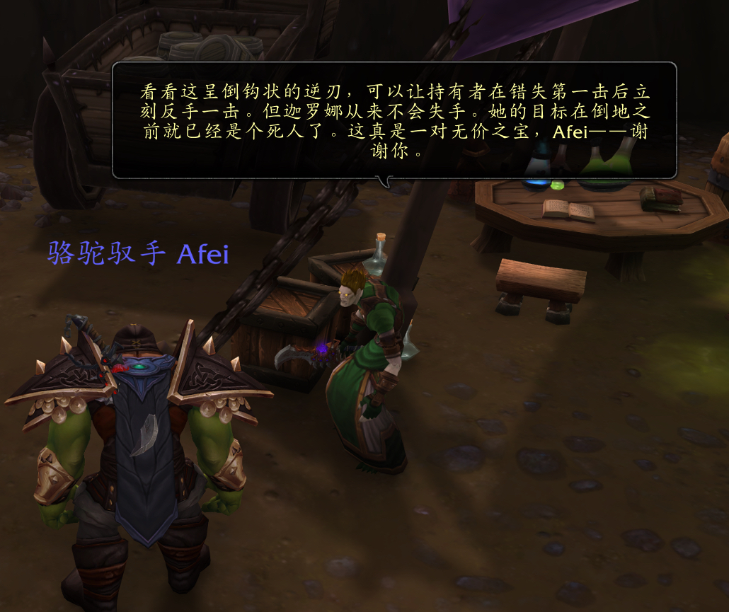你手持刺杀神器“痛楚”“哀伤”来到紫罗兰堡,这对神器来自传奇刺客半兽人伽罗娜,在协助泰斯公主解决暴风城危机,发现安度因失踪,伽罗娜暴风要塞故地重游后,她将自己的匕首托付给你,面见卡德加时。
