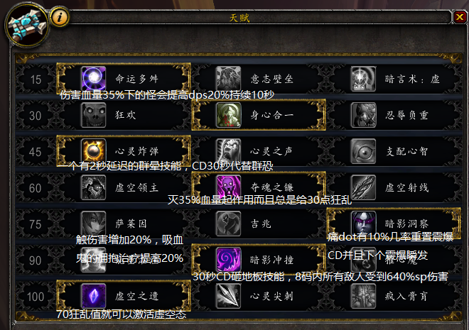 90级的暗影冲撞可以说如果你想有AOE能力的话必选。因为灼烧实在是太弱鸡。暗影冲撞则和心灵炸弹配合良好。