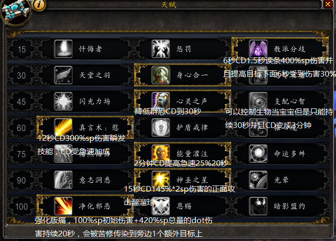 净化邪恶:110%sp初始伤害+600%sp总量(6.1sp)的持续20秒的dot伤害。会被苦修传染到旁边的1个目标上。基本上只要在怪身上会持续超过6秒性价比就高于惩击了。