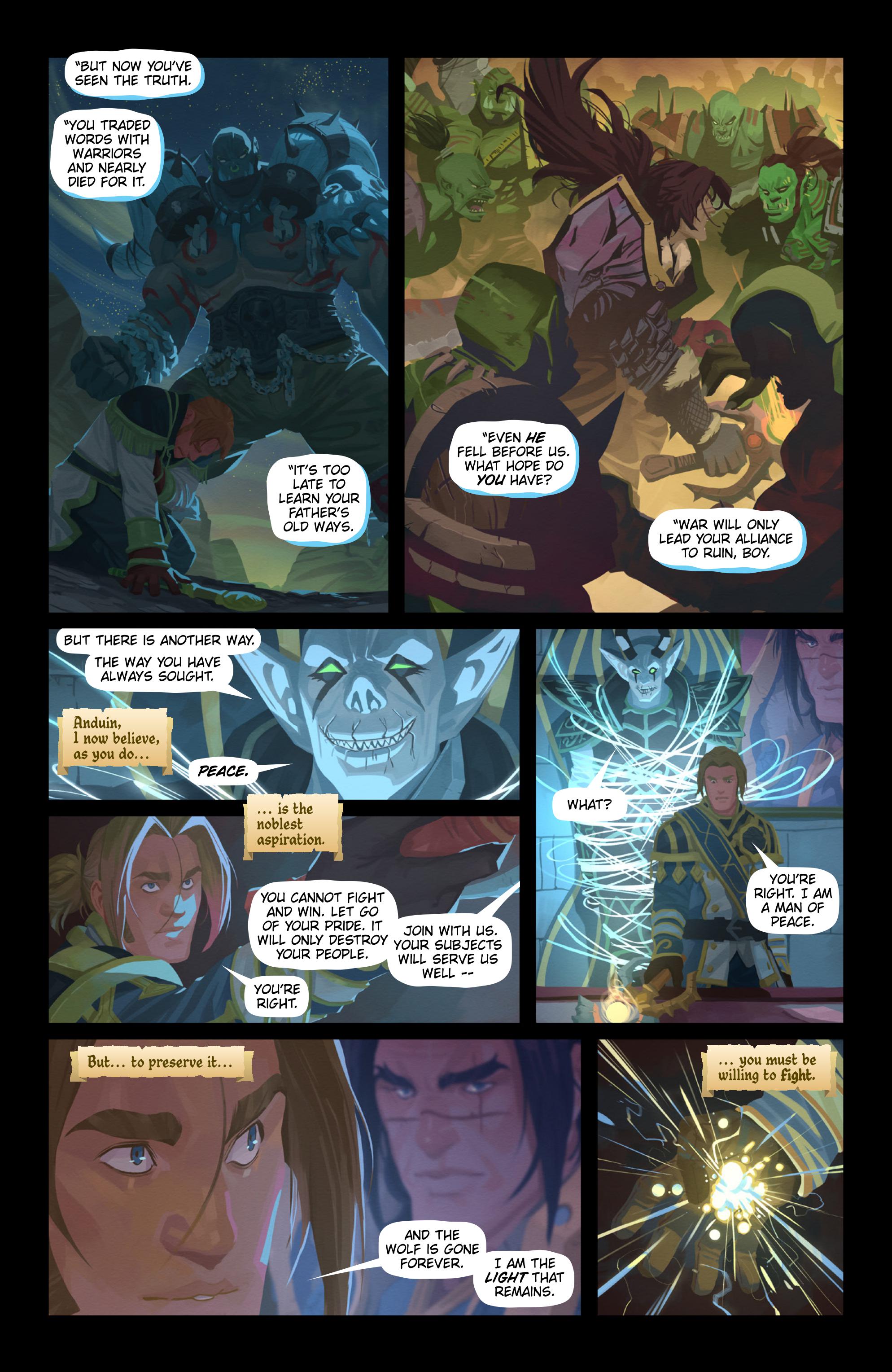 在《安度因:狼之子》中,一封来自安度因的父亲——瓦里安国王——的信中预言了即将到来的艰难时刻,鼓励这位年轻的统治者提升他的领袖气质与责任感。安度因必须面对他的恐惧,他能否在忠于自己信仰的同时,担起保卫艾泽拉斯的重任?