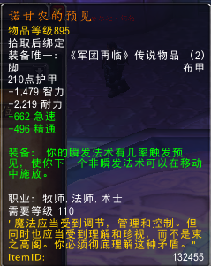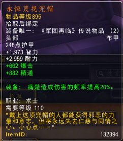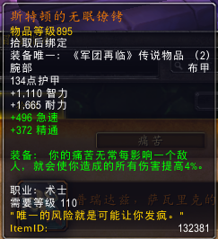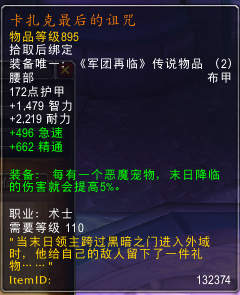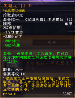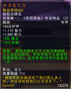 召唤大哥或者地狱火的时候自身会有一个30%的增伤持续25秒。内置CD3min,重新换装会导致3分钟内无法触发该buff。只能恶魔专精下拾取获得,但目前测试服情况是3系都能触发,估计是BUG。毁灭术用该护腕配合[灵魂神龛]单体非常爆炸。