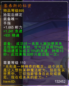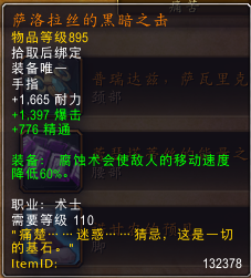 术士除大哥外唯一的减速。这是一个对dps看似没有什么提升的骚装备。在某些需要风筝的战术中可能有奇效。在痛苦aoe方面也有建树:远处来了一堆怪,第一时间上种子引爆群体腐蚀术减速,这样小怪就走很久才能走到近战位,你也就可以抢很多aoe伤害啦!