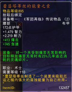 如字面意思。注意5%的伤害提升是加法提升,末日造成伤害瞬间根据场上宠物数量计算加成。一只宠物末日伤害x1.05,两只宠物末日伤害x1.1,三只宠物末日伤害x1.15....。.恶魔术单体boss平稳阶段一般能保证9只以上宠物同时存在,该腰带提升末日伤害至少45%以上。考虑到恶魔特质对末日的加成,提升只能算是中规中矩。