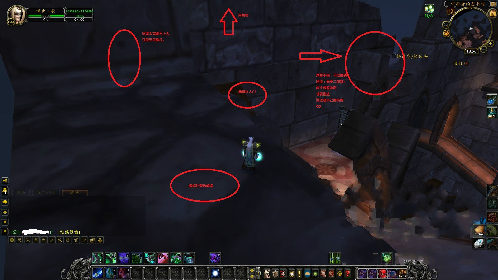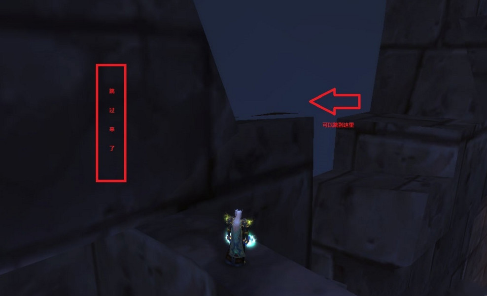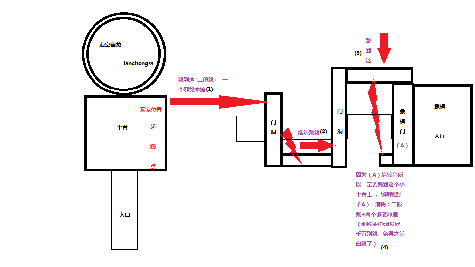第一跳:这里需要 二段跳 +一个邪能冲撞 直接跳到第一个门洞上