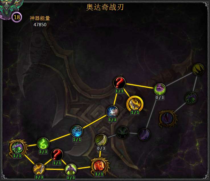 当所有大特质点亮的同时,会开启新的大特质(宇宙特质)灵魂吞噬者:使你的总生命值提高5%,并且开启神器特质的巅峰等级,因为我自己在BETA并没有点出,通过以前的法师朋友点出来的情况来看可能为每级0.5%血量加成。点取的要求就是全部17个特质(共计35点)都点亮并点满。顺便一提,所有神器上的圣物只能对应加强小特质,不能对中、大、起始特质造成影响。