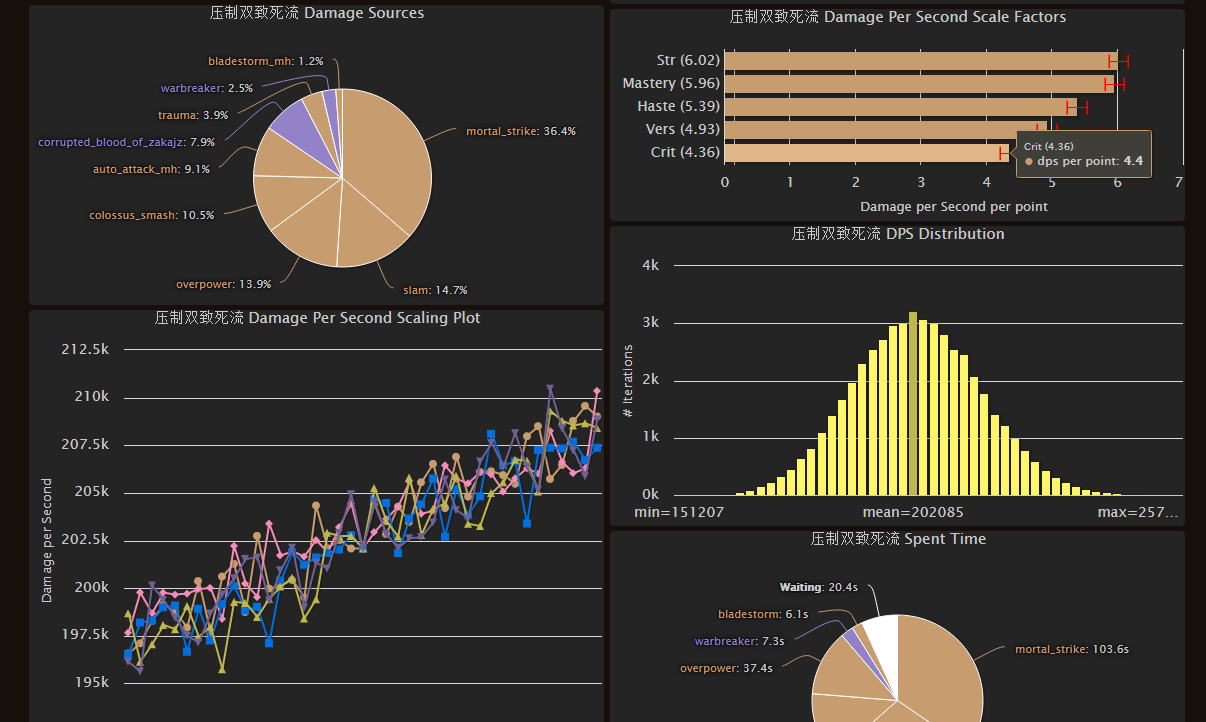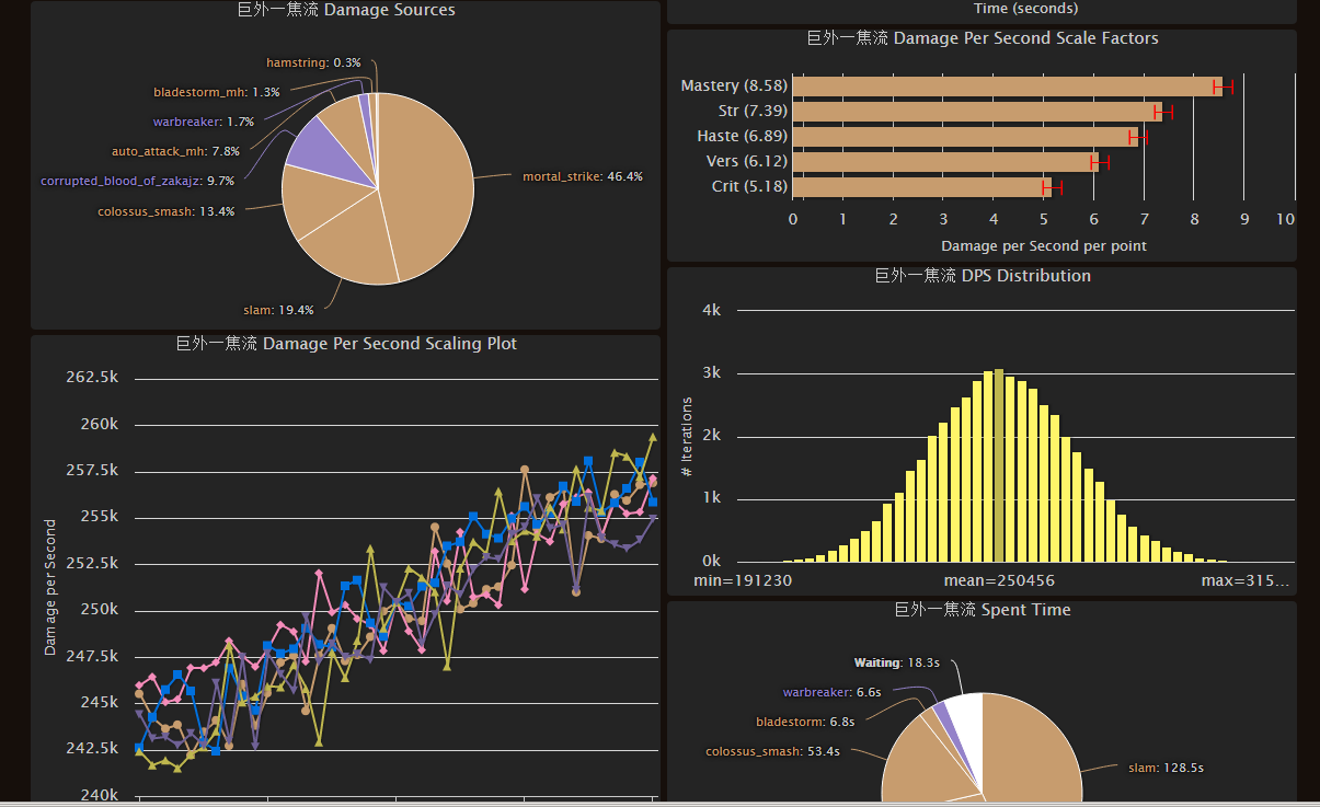 一聚焦致死流DPS:248167 致死占比48.3%猛击占比17.3% 等待时间33s 比SIMC目前模版手法高3%,说明目前的SIMC模拟手法并没有进行更新!