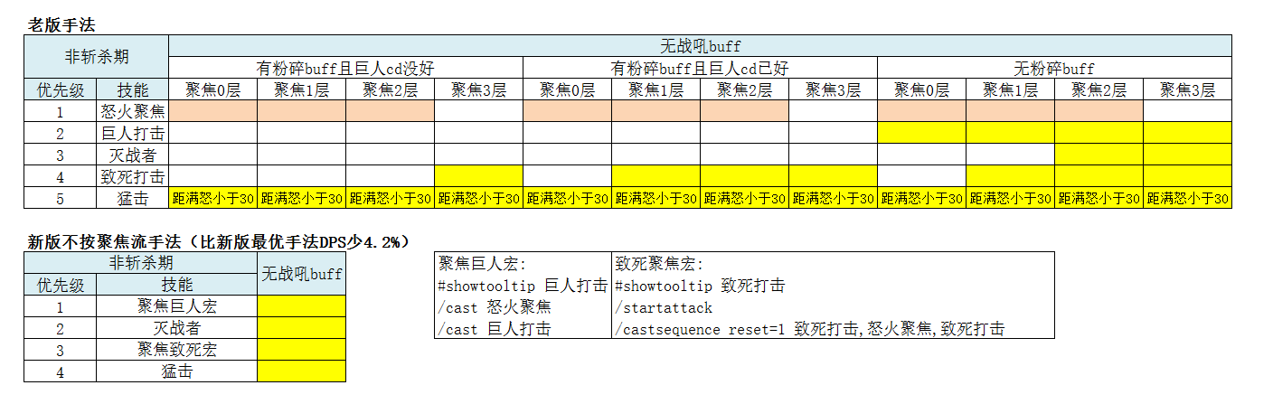- 巨外一焦流是目前dps最高的手法,简单讲就是巨人内猛击填充,巨人外先打一层聚焦再打猛击填充,牺牲聚焦吃到粉碎buff的几率,提高怒气吃到粉碎buff内的几率,从而提高总体怒气效率