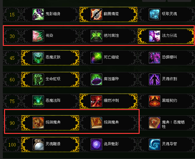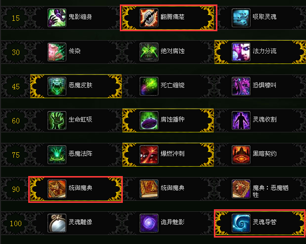 基本上就是这套天赋,如果你比较勤快。。选个虹吸啊,法力分流啊,也可以。如果四龙就特别想AOE,那就换成种子。如果特别懒,那就选导管吧。。。 手法:这个手法其实没什么太多可说的,主要还是灵魂收割也就是老黑魂的开启时机,要自己多打打去把握,同时开灵魂收割的时候已经要有3层以上神器跟着一起开,不然就是巨大的浪费,最好的情况就是场面上N个目标有痛楚,并且存活目标非常多的情况下开启。 痛苦术的一切都没有绝对,你也可以创造无限可能!!~