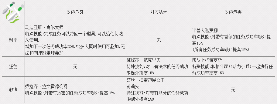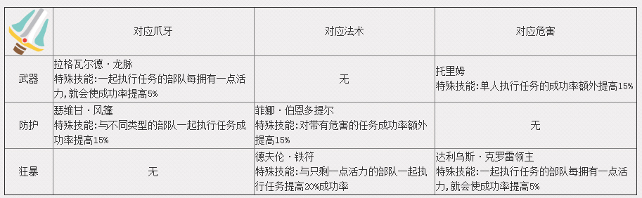 还有一个位置建议使用主母玛沃伦丝拥有缩短任务时间20%这个技能,比较不错,还有一个技能是不和其他勇士一起执行任务的(小兵不算)成功率增加15%意义不大。