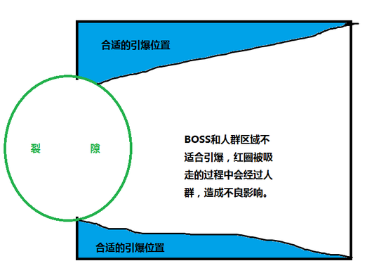 (8)一般来说会安排LR带宝珠,所以这也是开荒推荐兽王的原因,首先进入P3一定要明确裂隙的位置,然后看见出宝珠的光柱时,第一时间靠近,宝珠生成之后会连线到你,利用后跳迅速拉开距离带到适合的位置引爆,宝珠追人速度很快,所以要明确裂隙位置让后跳准一点。裂隙会把宝珠爆炸之后生成的红水吸进去然后吃掉,良好的引爆宝珠位置如图所示(裂隙出在其他位置同理)