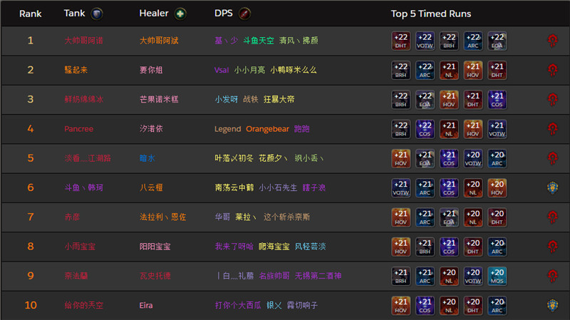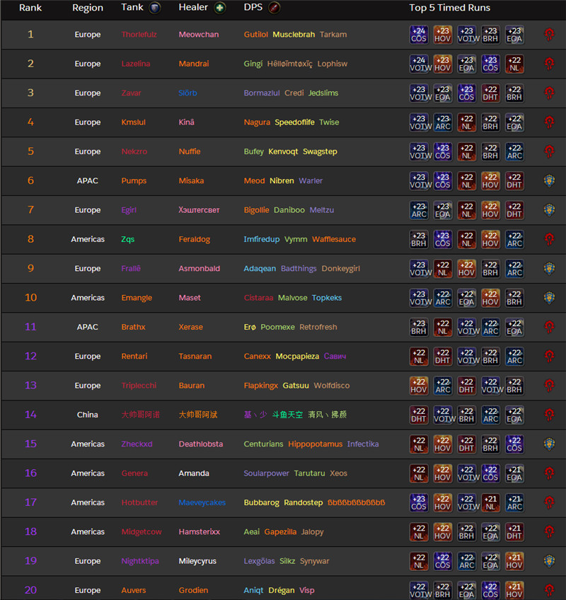 试炼场阶段,欧美国服的诸多队伍都在不断冲击高层,两周下来,全球各服的前十战绩如下: