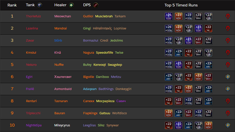 欧服:前两名是仅有的2支限时突破24层大秘境的队伍,而有23层限时记录的队伍也是最多的。