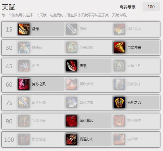 常驻单体天赋:坚定、再度冲锋、撕裂、复苏之风、泰坦之力、杀心骤起、机遇打击。