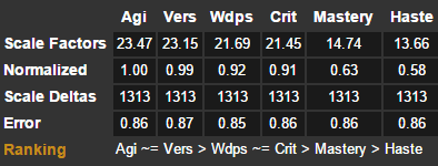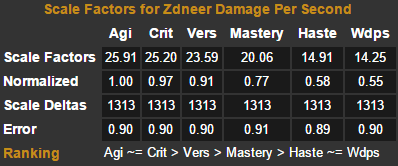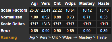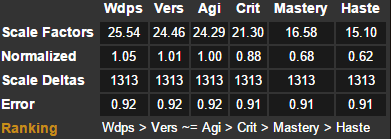 6。为了便于大家参考,对部分属性做个解释:Wdps武器伤害、Agi敏捷、Vers全能、Crit暴击、Haste急速、Mastery精通。