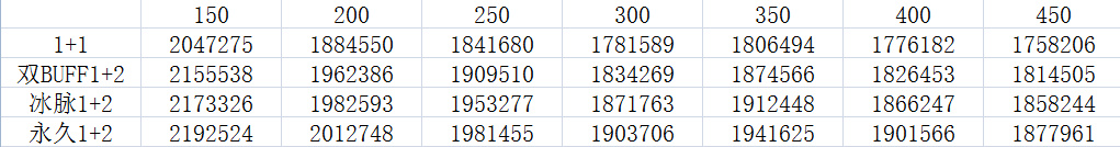 单冰脉1+2提升5.06%-6.16%,双BUFF1+2提升2.96%-5.29%,永久1+2提升6.8%-7.59%。